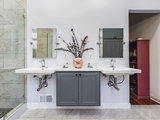 This Virginia couple didn’t just want a more functional bathroom — they needed one. The husband uses a rollator walker and crutches, so the built-in vanity, bulky jetted tub, narrow entry and curbed shower stall made navigating the space extremely difficult.